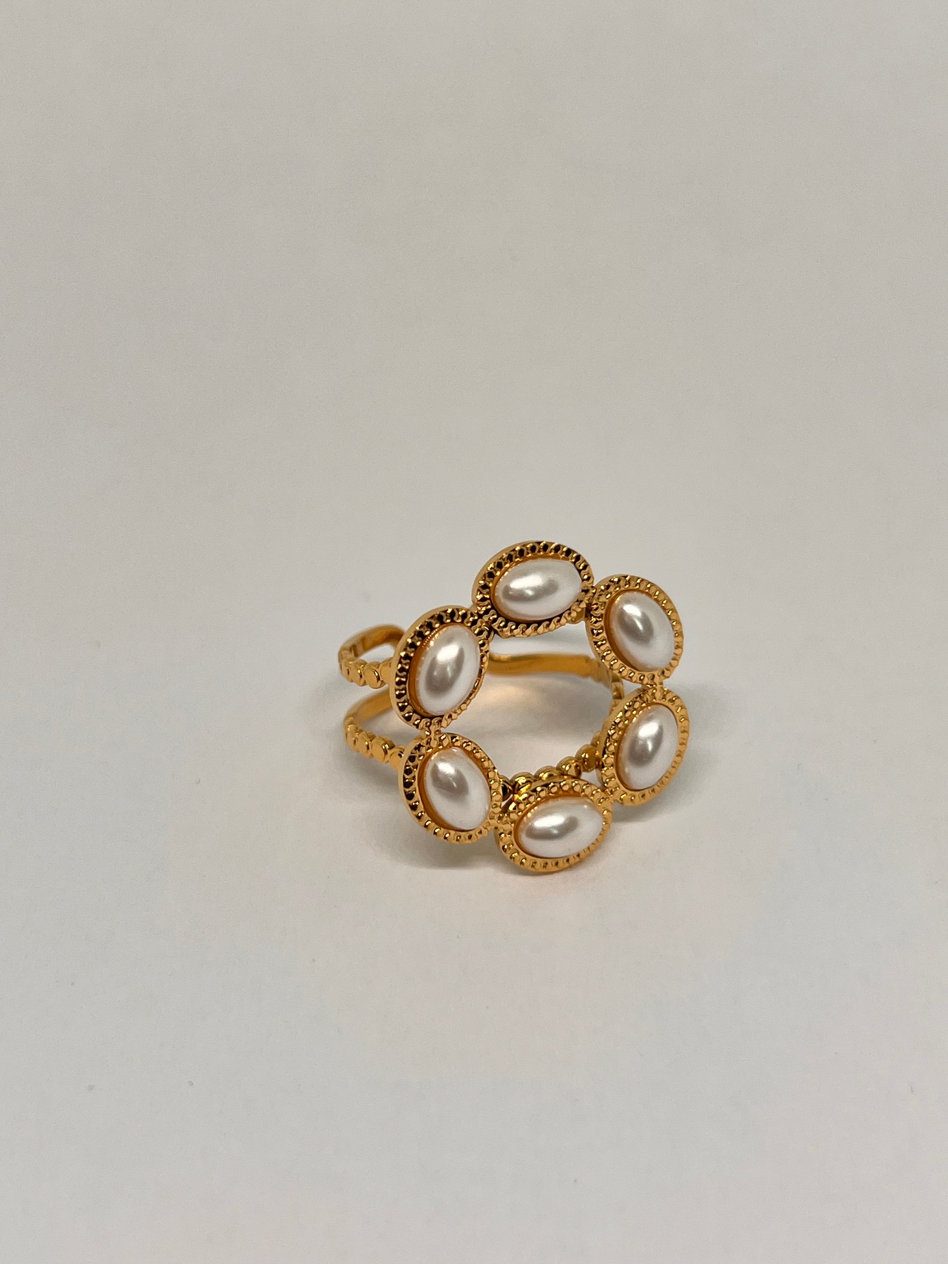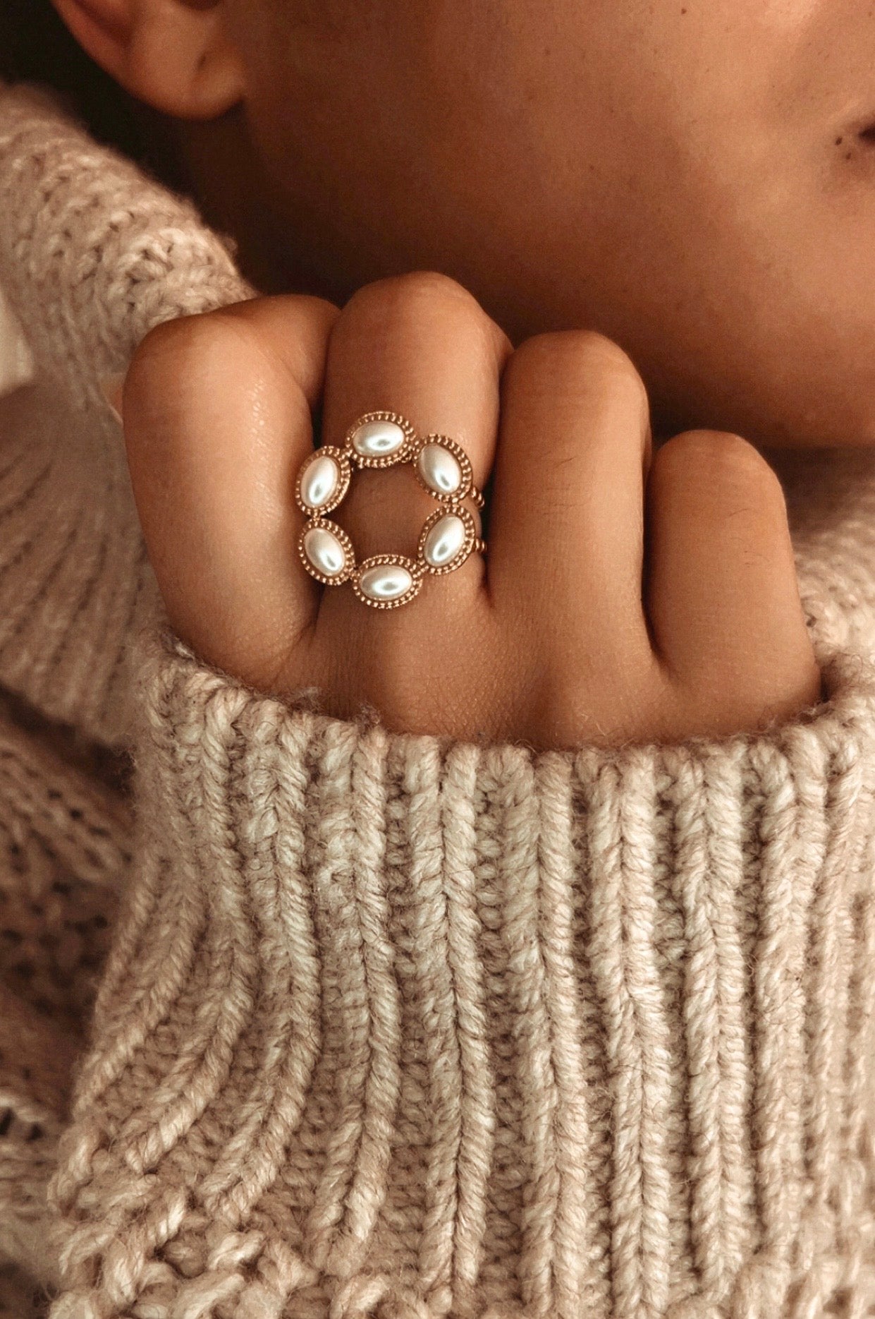 Tout en rondeur et en éclat, la bague Iséa se compose d’un anneau de perles nacrées formant une couronne raffinée.
