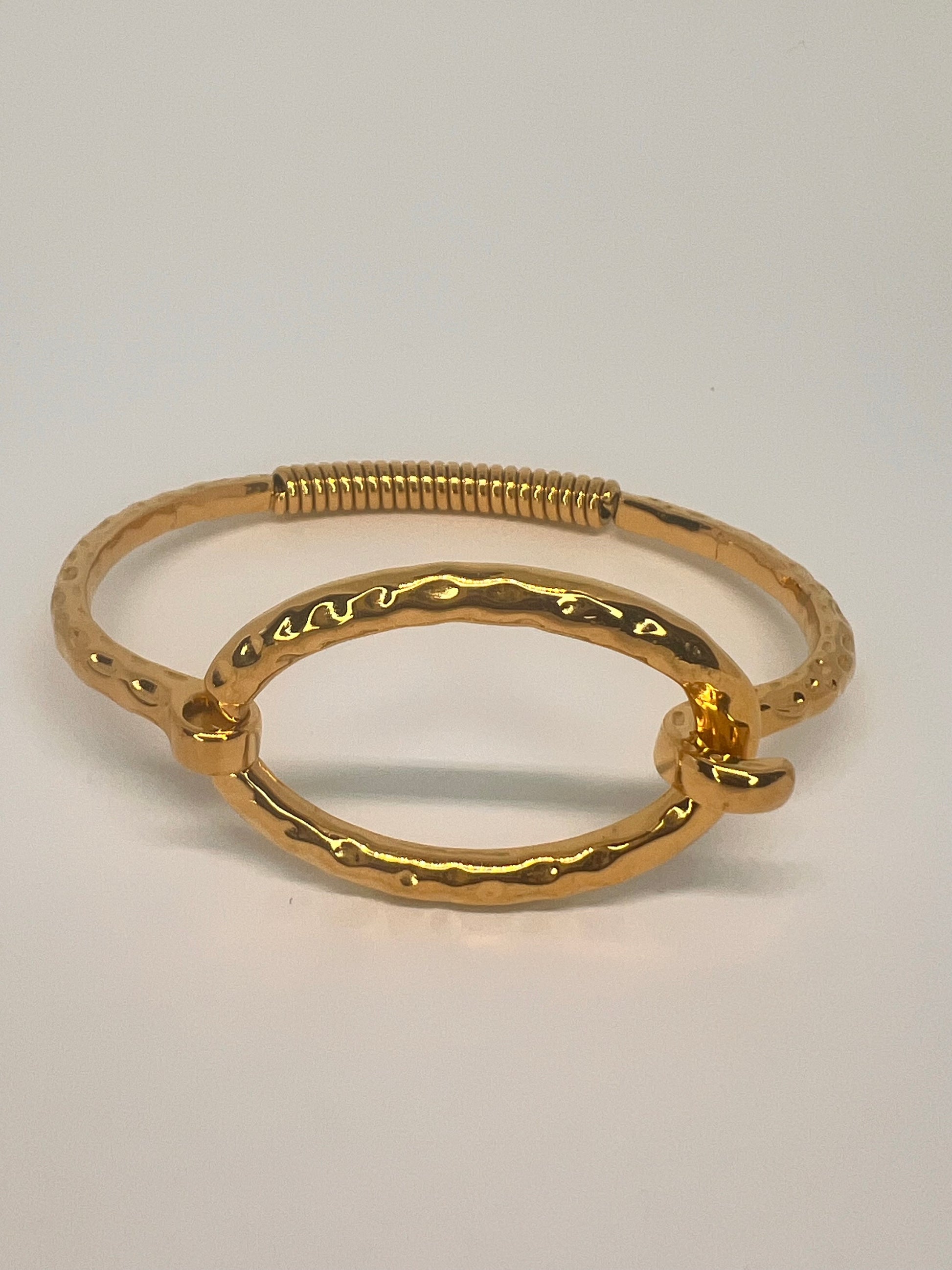 Bracelet en acier inoxydable doré, orné d’un cercle martelé au centre.