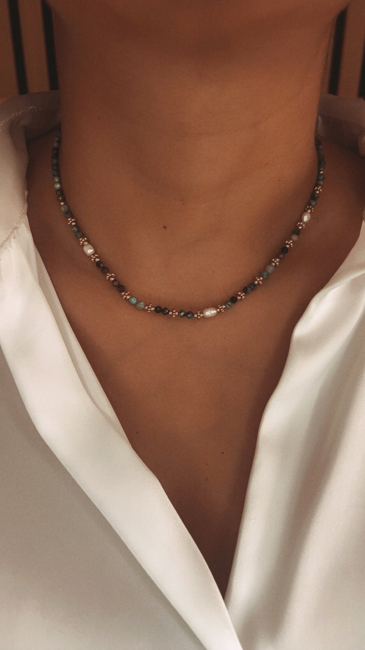 Alliance subtile de perles d’eau douce et de pierres naturelles en turquoise africaine, le collier Évaé capture la beauté brute de la nature.