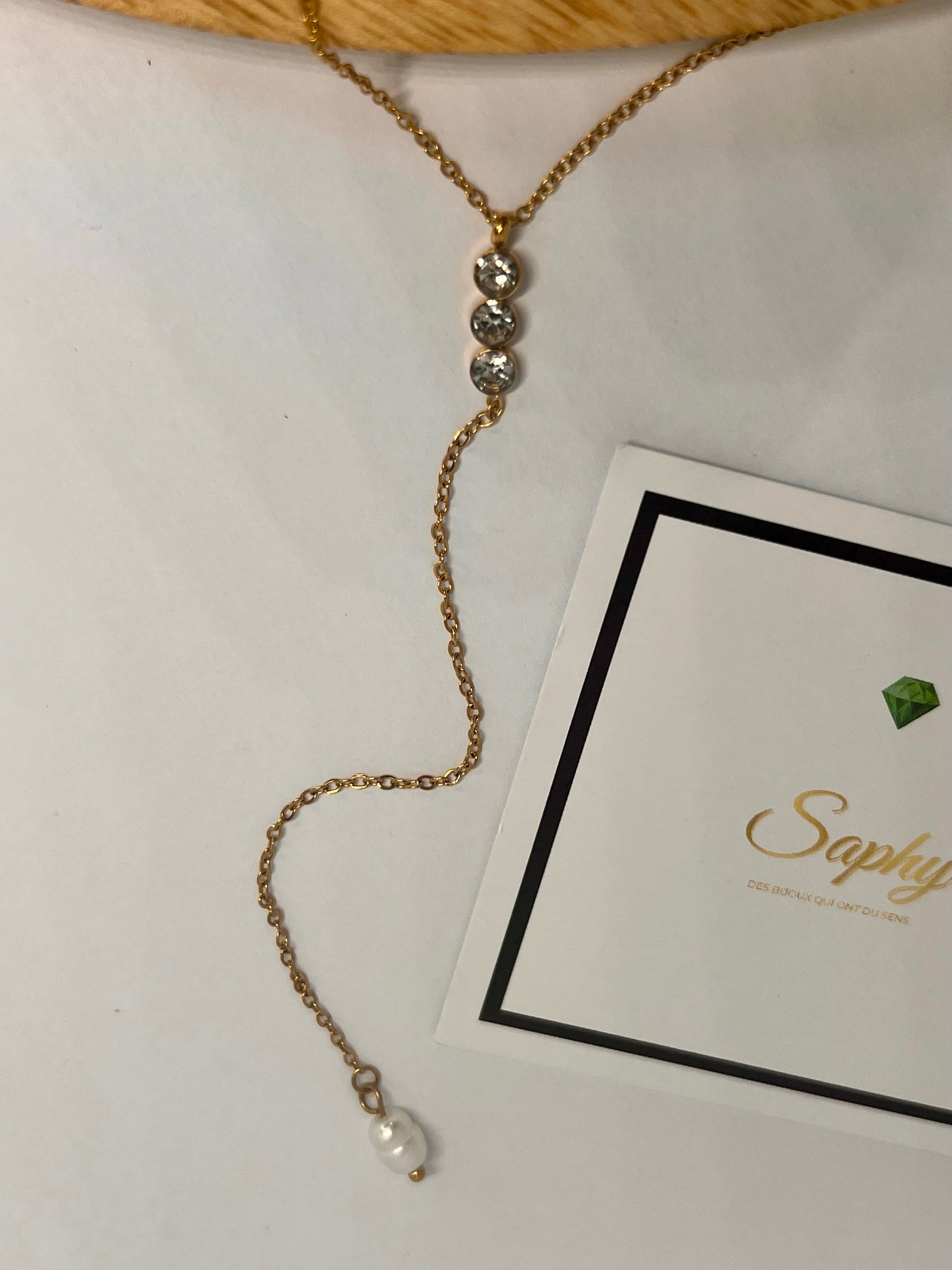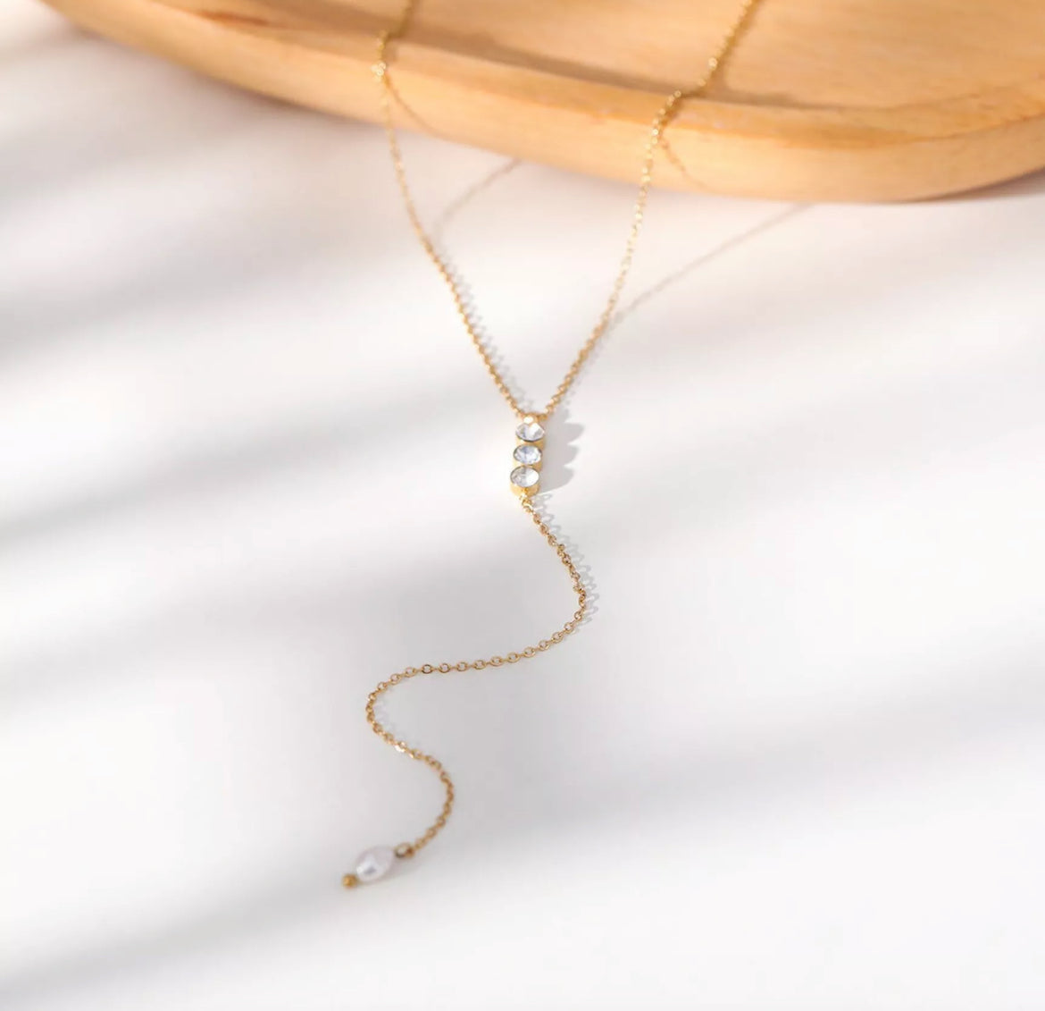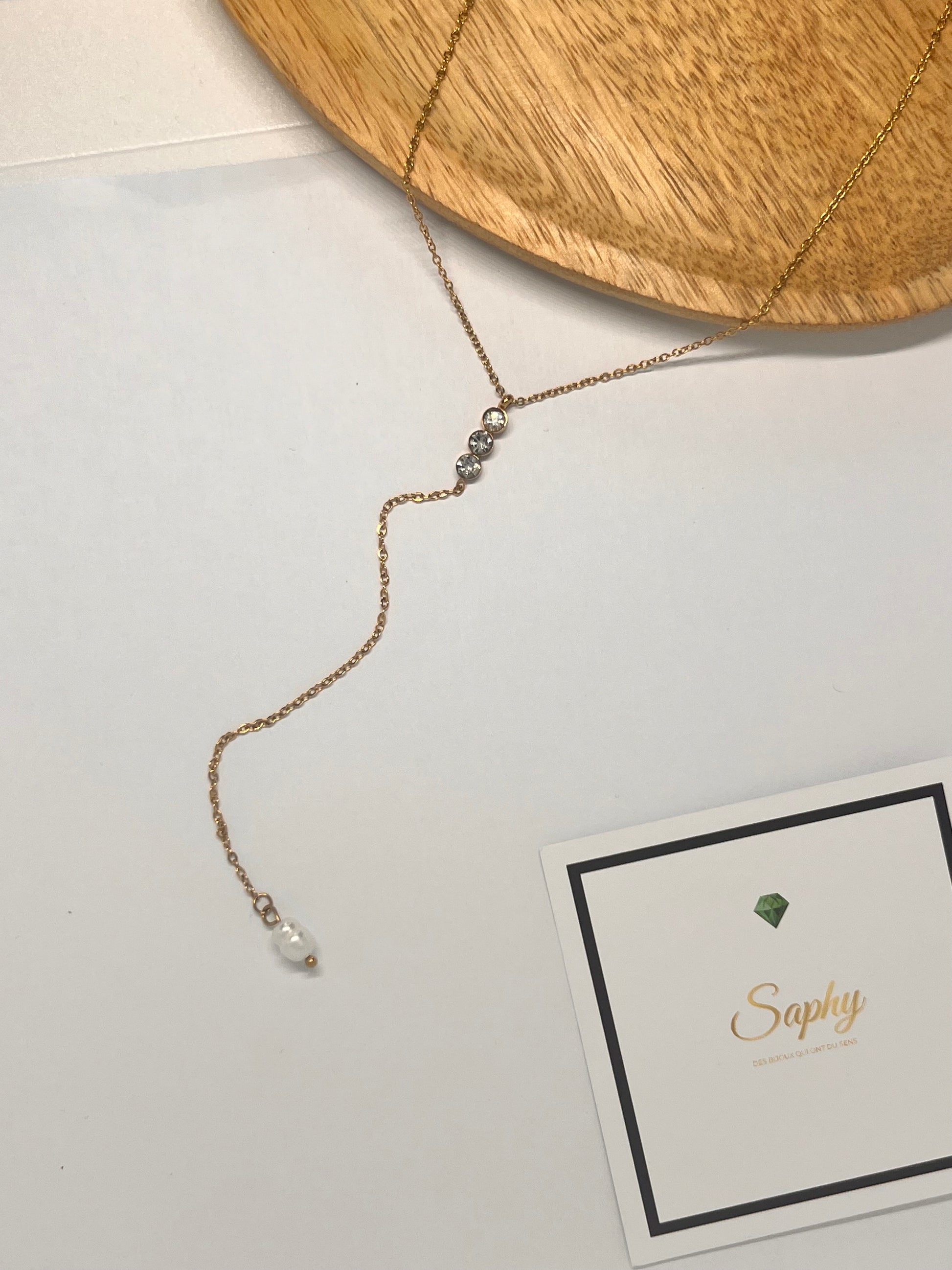 Collier en Y ultra délicat avec perle d’eau douce pendante et strass.