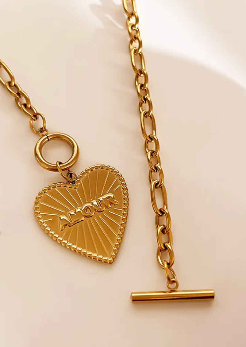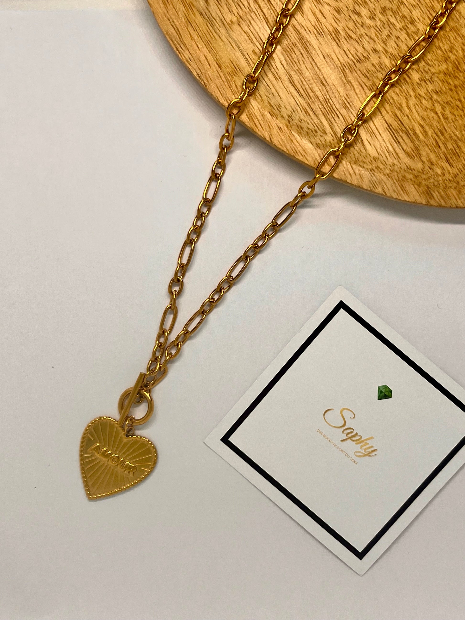 Collier chaîne large avec médaillon cœur gravé “Amour”.